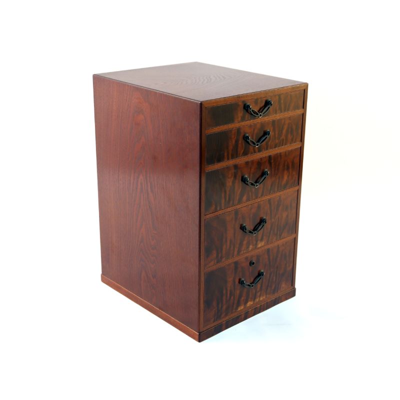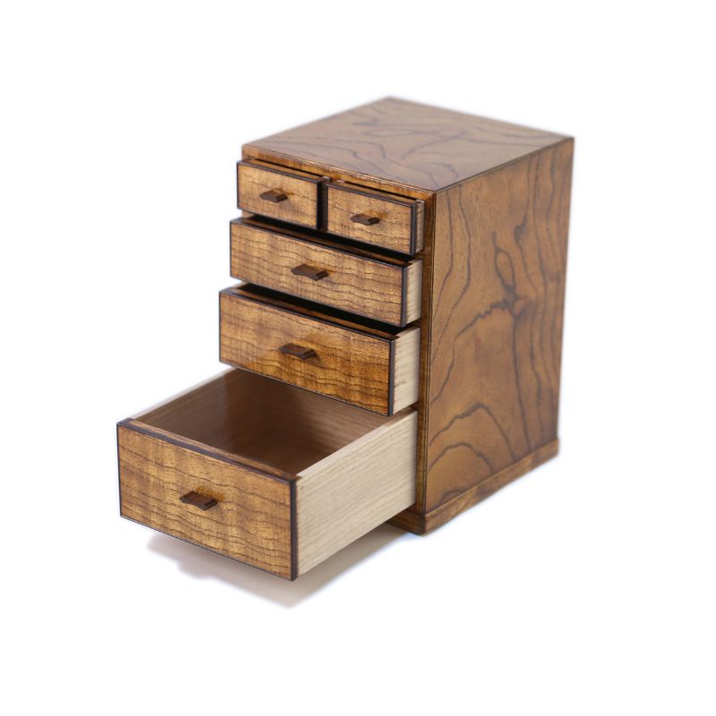大学で服飾について学ぶなかで、伝統技術の後継者の重要性を知り、家業の技術を伝承したいと思い、父・光さん(区登録無形文化財保持者)について修業した。祖父・禀三さん(故人、元区指定無形文化財保持者)から続く渡辺和家具製造の三代目。渡辺さんは父とともに、箱ものや姫鏡台、細かな調整が必要な小引出など、高度な技を要する作品づくりにも取り組んでいる。